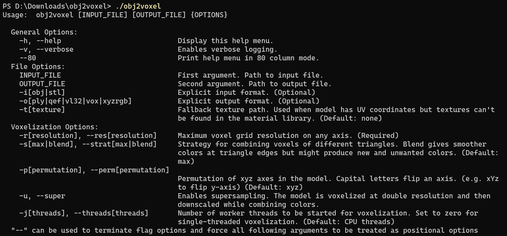 & "D:\Downloads\obj2voxel\obj2voxel.exe" blasterA.obj blasterA.vox -r 64 输出: [INFO] Converting "blasterA.obj" to "blasterB.vox" at resolution 64 with strategy max [INFO] Loaded 0 material textures [INFO] Cached model with 382 triangles [INFO] Voxelized 382 triangles, writing any buffered voxels ... [INFO] All 4,339 voxels written [IMPO] Done! (23.48 ms) 如果是Done! 的话说明成功了